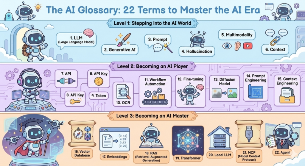 Welcome back to learnwithandric. As I build my AI projects and automate financial workflows, I’ve realized that understanding the “language of AI” is the first step to mastery. Here is a breakdown of 22 essential terms, categorized into three levels to help you go from a beginner to an AI master.
