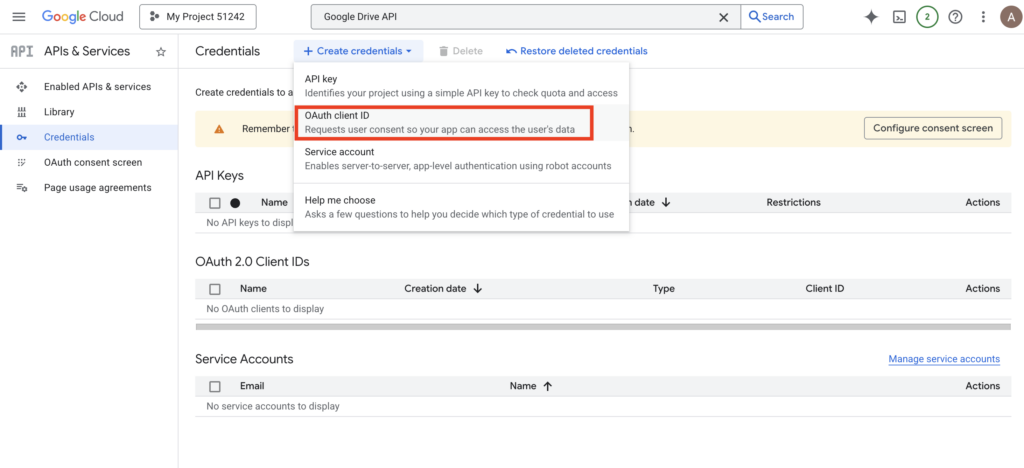 - Click “Create Credentials” again and select “OAuth client ID”.
