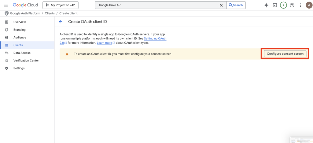 - Click “Configure Consent Screen” to begin.