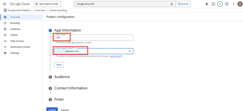 - Enter an App Name (for your reference) and User Support Email (select your own), then click Next.