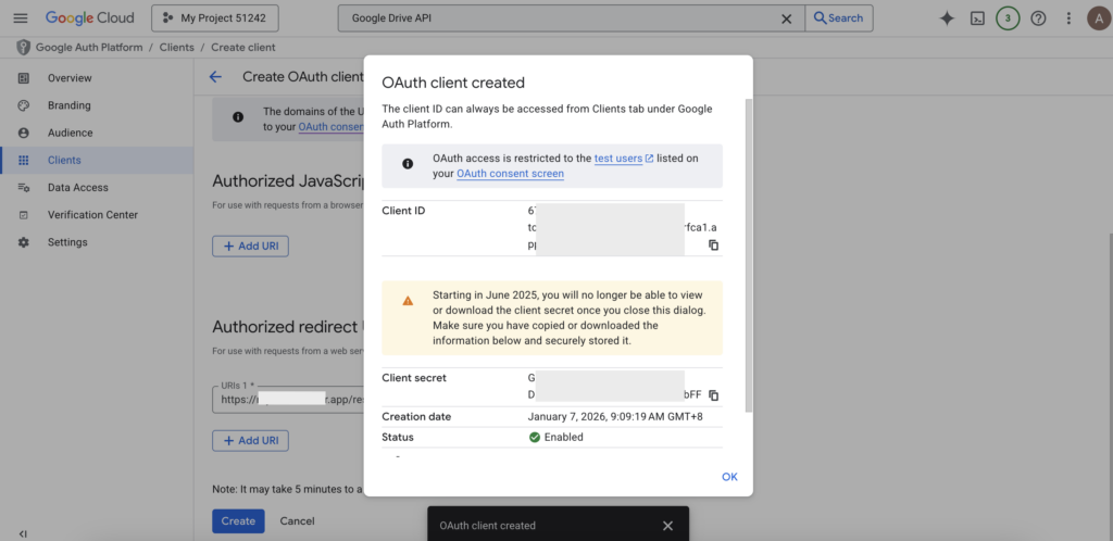 4. Paste that URL back into your Google Cloud Console under “Authorized redirect URIs” and hit Create.