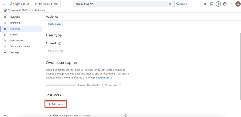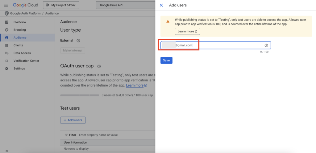 - On the OAuth Consent Screen page, scroll down to “Test users.” Click “Add Users” and enter your Gmail address.