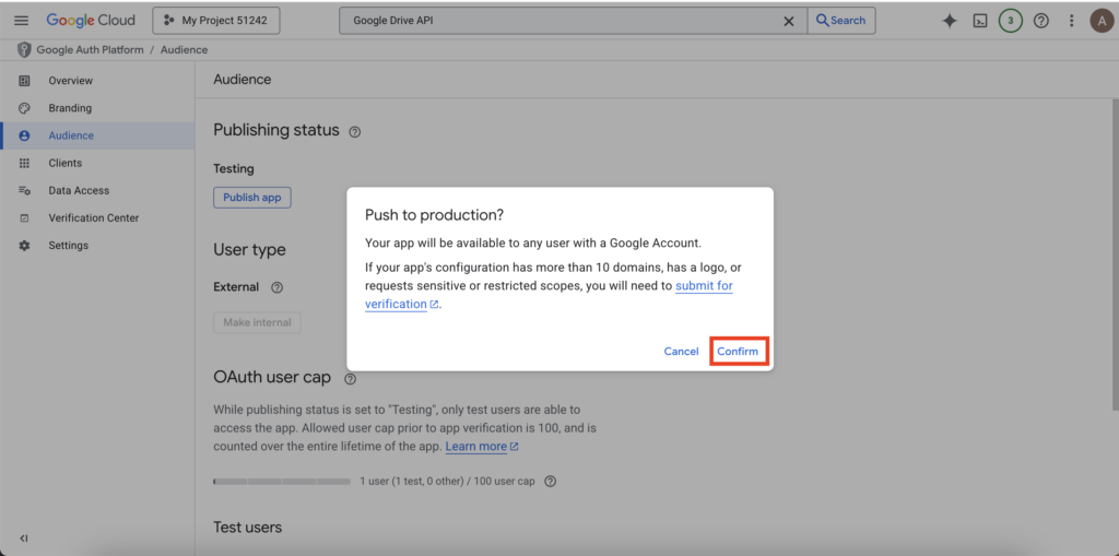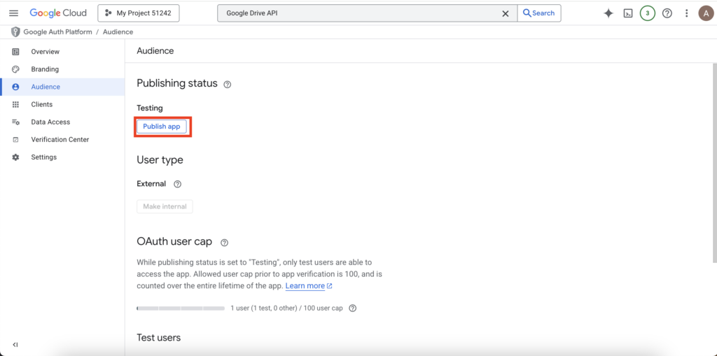 1. Go back to the OAuth consent screen in Google Cloud. Under “Publishing status,” click “Publish App”.