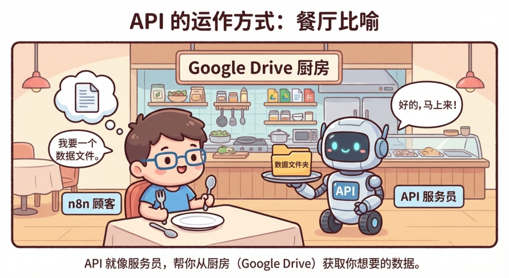 你可以把 API (应用程序接口) 想象成餐厅里的“服务员”。你(n8n)是顾客,而厨房(Google Drive)拥有你想要的数据。你不能直接冲进厨房,而是把你的需求告诉服务员,由服务员把“菜”(数据)端给你。
