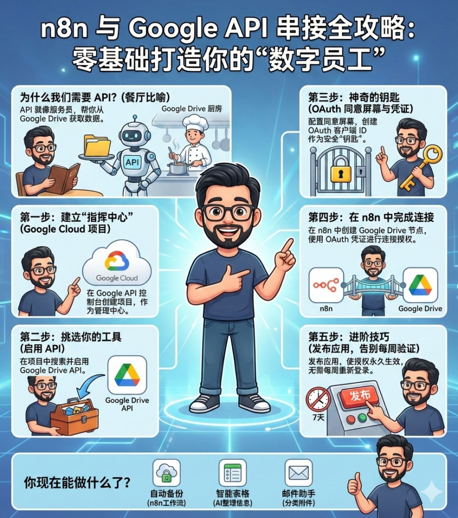 欢迎来到自动化实验室!如果你正在阅读这篇文章,说明你已经意识到 n8n 是连接各种应用的强大神器。但要让 n8n 真正变“聪明”,它需要学会和你每天使用的工具打交道 – 特别是 Google 系列(云端硬盘、表格、Gmail 等)。
