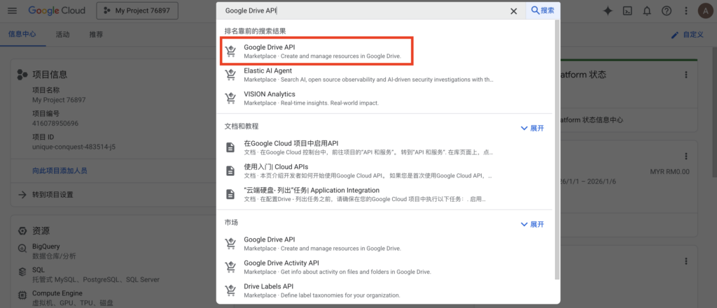 - 在顶部的搜索框输入 “Google Drive API”。