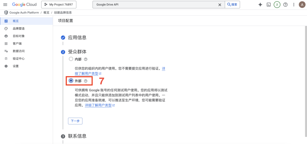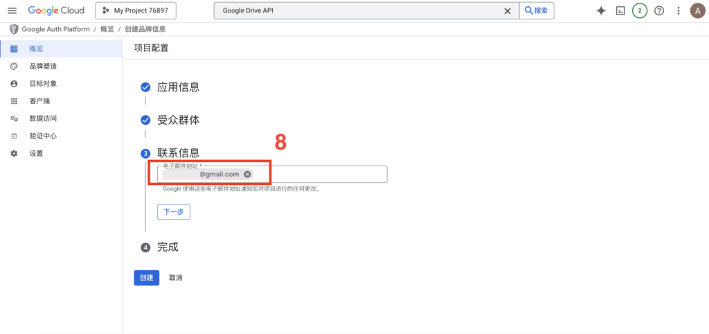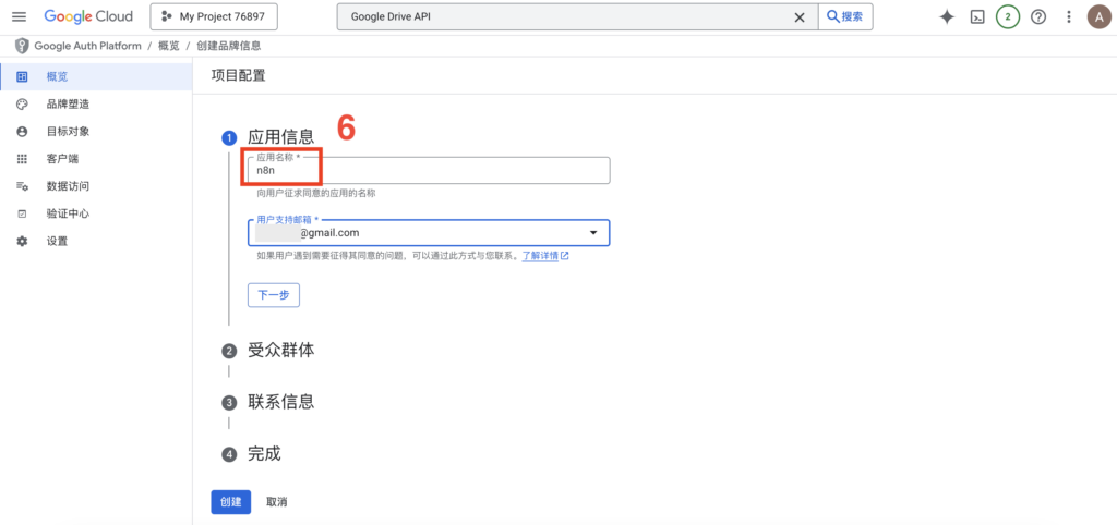 - 填写应用名称(自定)和用户支持邮箱(选你自己的邮箱),点击下一步。