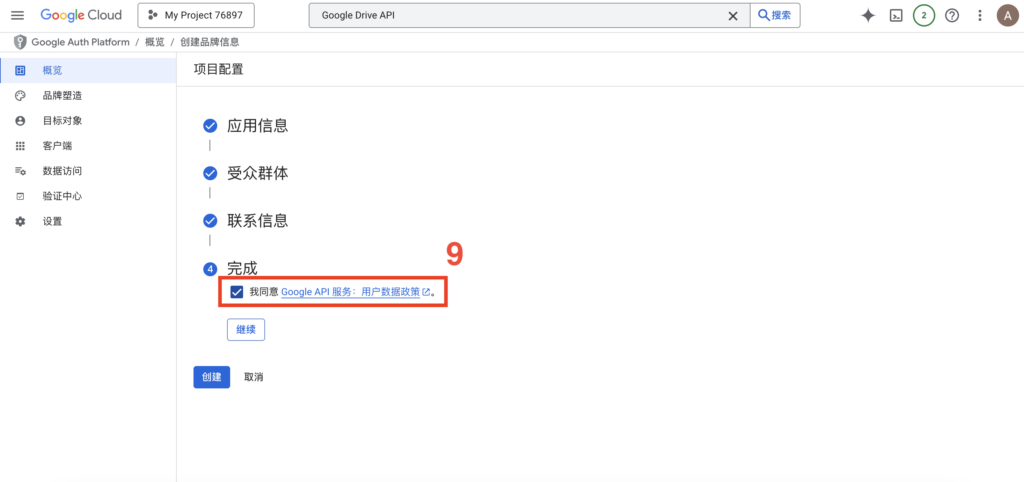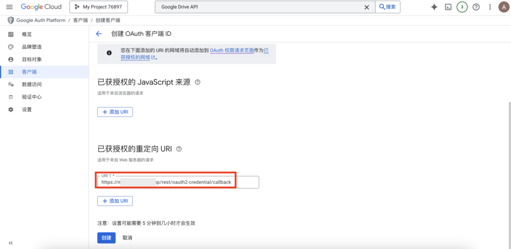 回到 Google Cloud 控制台,把这个 URL 贴进刚才提到的“重定向 URI”框里,点击创建。