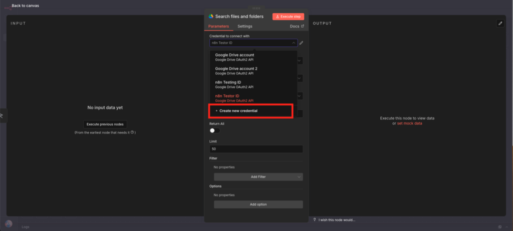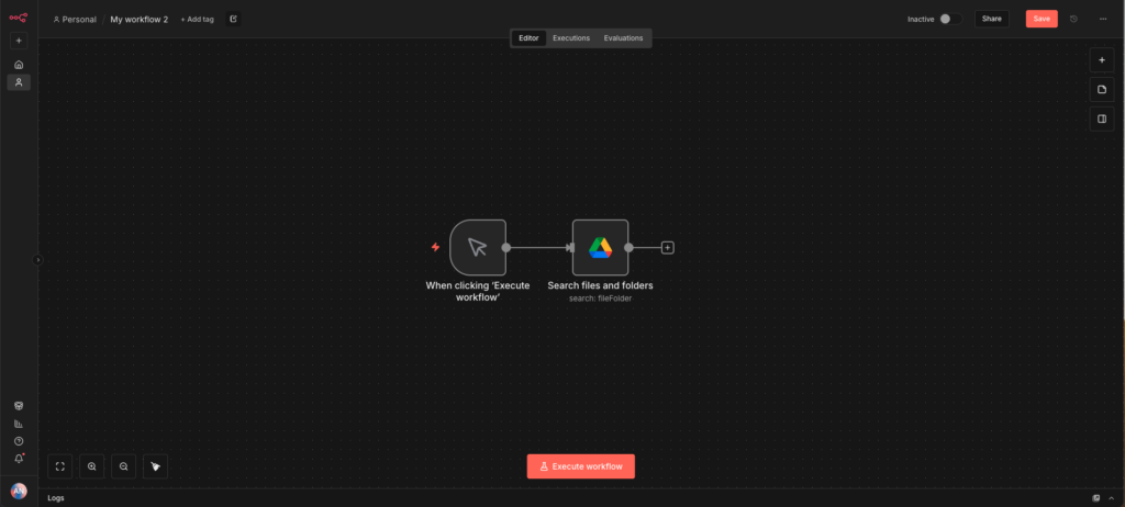 现在,回到你的 n8n 界面。在画布上添加一个 Google Drive 节点。