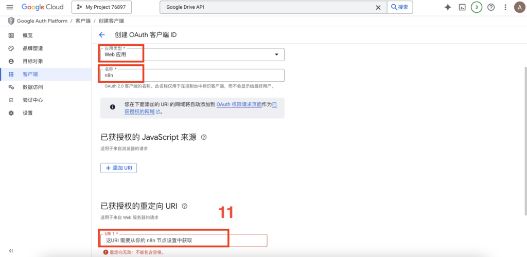 - 已授权的重定向 URI:这是最容易卡住的地方,此 URI 需要从你的 n8n 节点设置中获取。
