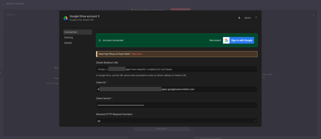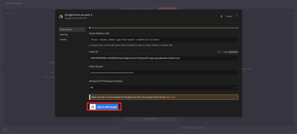 最后,点击 n8n 里的 “Sign in with Google”。按照提示完成授权。当你看到绿色的勾选标记时,恭喜你,桥梁搭建成功!