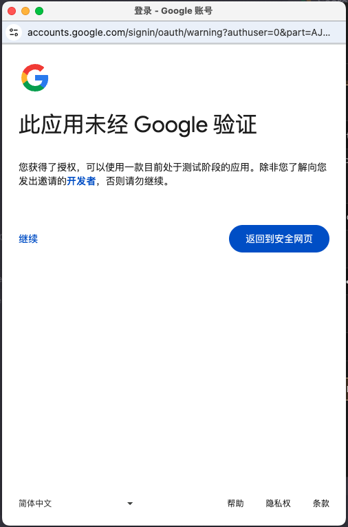 在弹窗选择刚刚加到测试使用者的帐号,按继续。