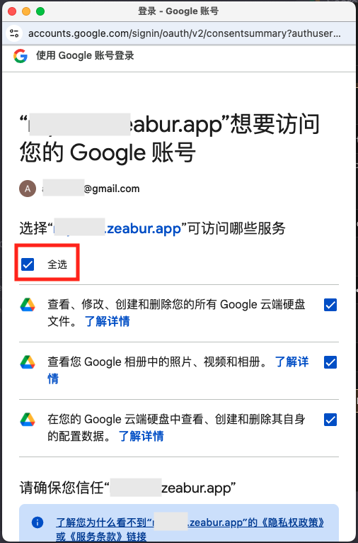 勾选所有权限,滑到最底下按「继续」