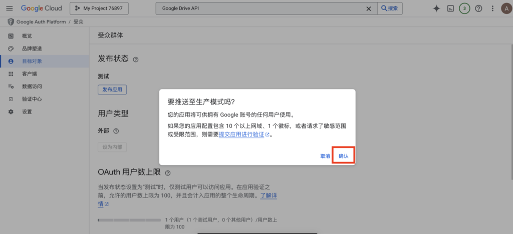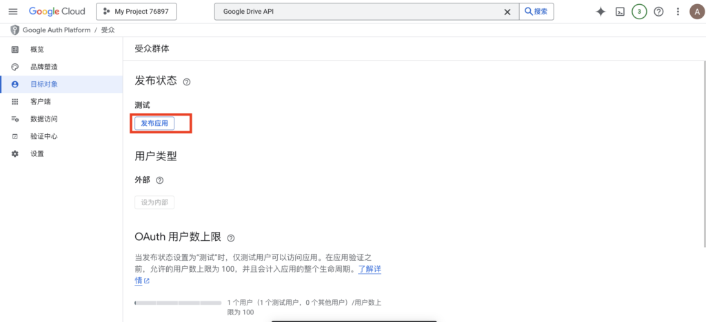 回到 Google Cloud 的 OAuth 同意屏幕 页面。在“发布状态”下,点击 “发布应用” (Publish App)。